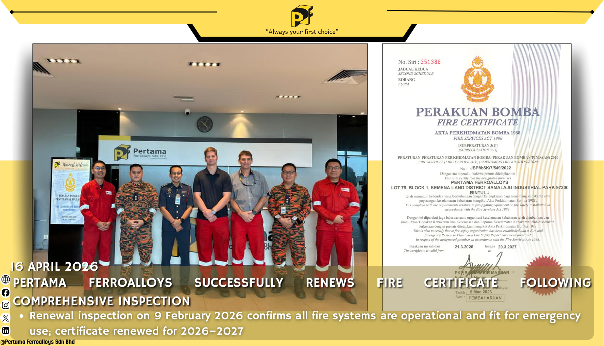 Pertama Ferroalloys Sdn. Bhd. has successfully renewed its Fire Safety Certificate for the 2026–2027 period following a comprehensive inspection conducted with the Fire and Rescue Department of Malaysia (BOMBA) on 9 February 2026. All fire protection systems were confirmed to be fully operational and fit for emergency use, reaffirming PFA’s strong commitment to safety and regulatory compliance.